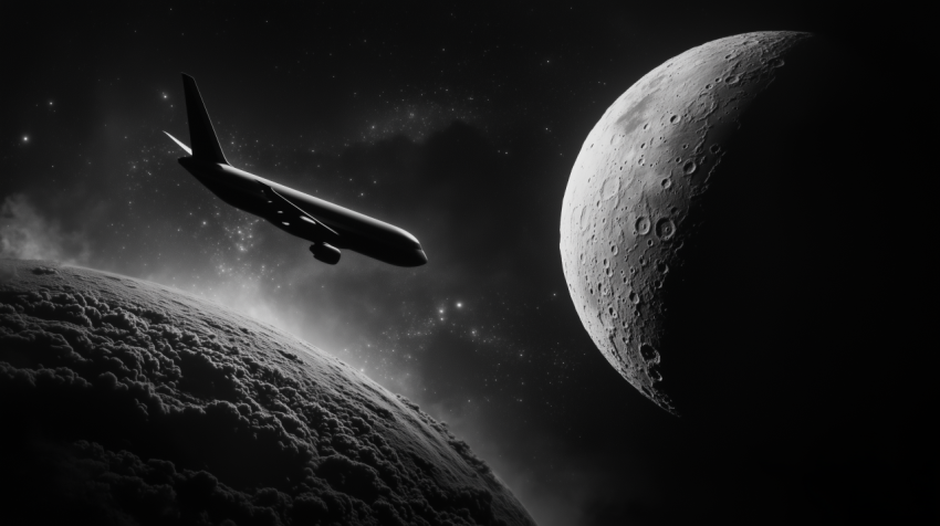 Airplane Silhouette Against a Celestial Moonlit Sky