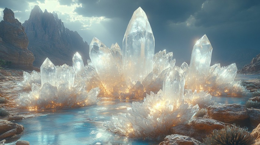Alien Crystal Landscape with Turquoise River and Mountains