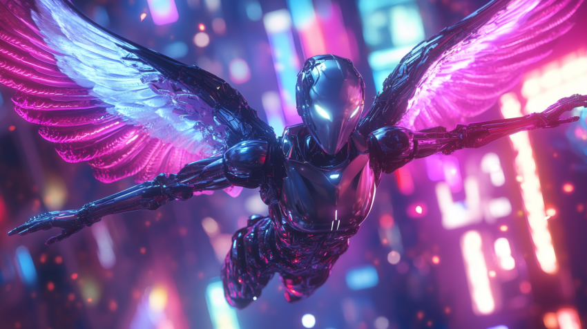 Futuristic Cybernetic Angel with Neon Wings in Cityscape