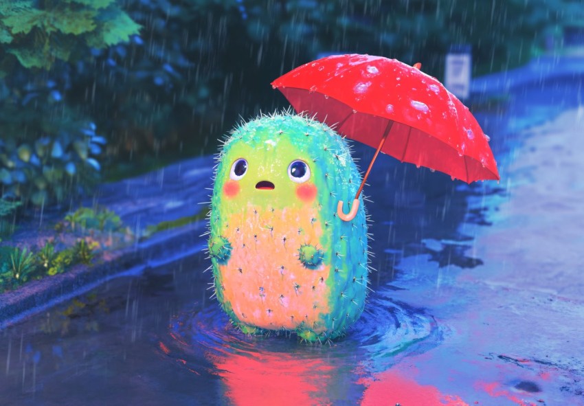 Sad Cactus Holding Umbrella in the Rain Artwork