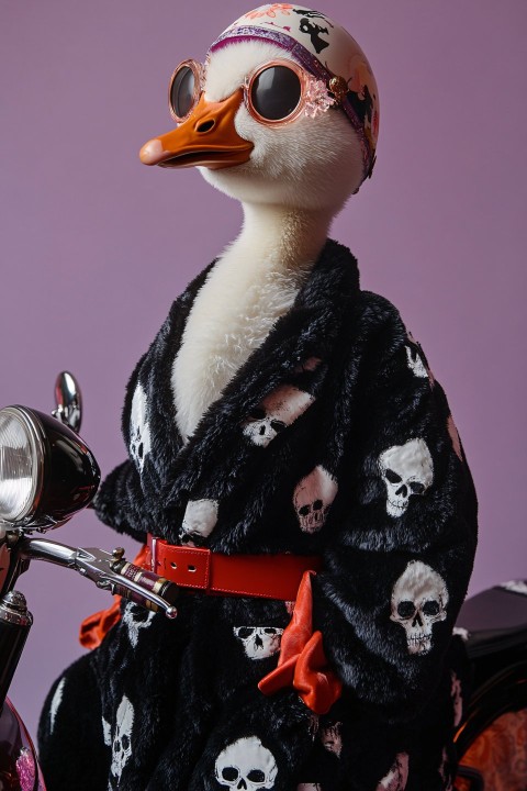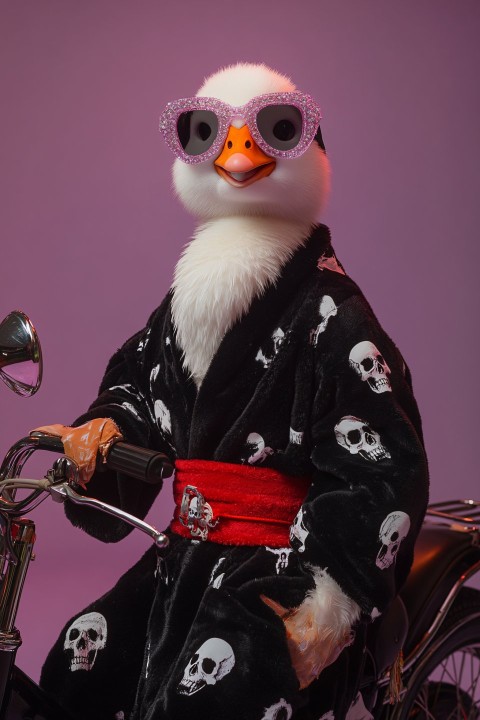 Cute Goose in Versace-Style Robe on Motorbike Portrait