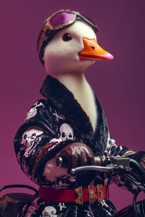 Cute Goose in Versace-Style Robe Riding Motorbike Portrait