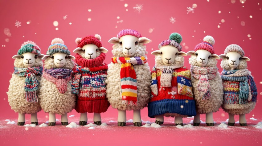 Group of Sheep in Colorful Winter Clothes on Pink Background