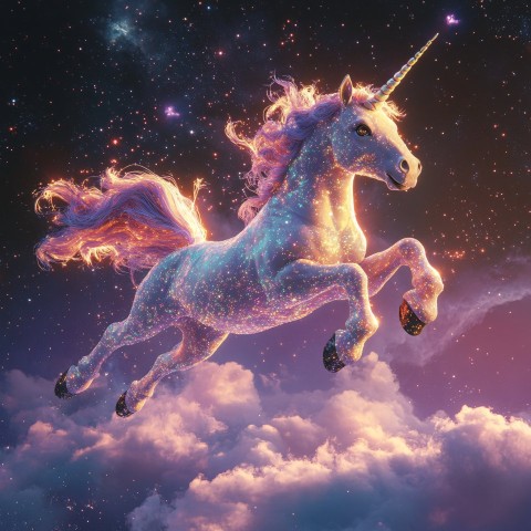 Flying Unicorn in Glittery Space with Vibrant Colors