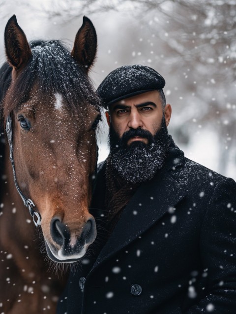 Turkish Man Posing with Horse in Snowy Winter Scene