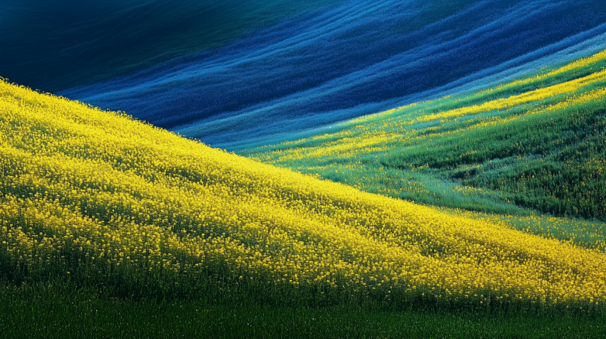 Rolling fields of yellow and blue wildflowers on a sloped landscape