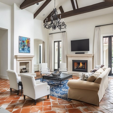 Living Room with Terracotta Tiles and Brown Sofas by Admin