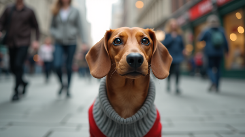 Adorable Dachshund Wearing a Sweater in a Busy City Street