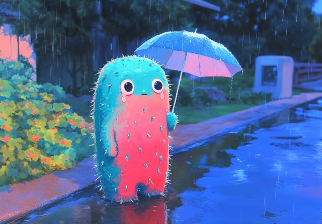 Sad Eldritch Cactus Holding Umbrella in Rain