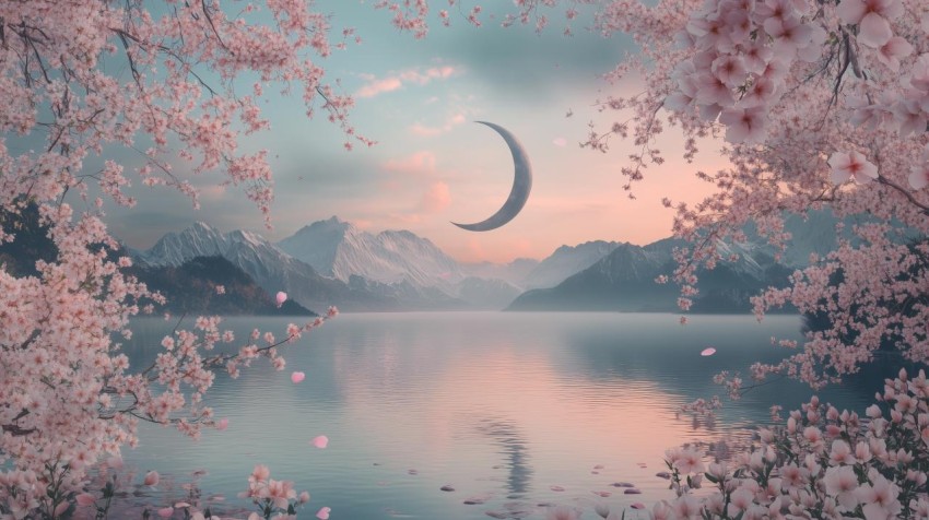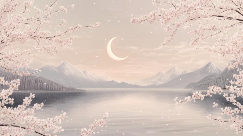 Moonlit Cherry Blossoms Over a Quiet Lake