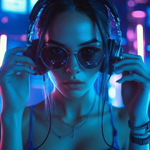 Cyberpunk Portrait of Woman with Headphones and Sunglasses