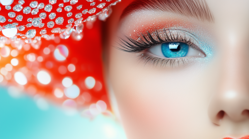 Glamorous Close-Up of a Sparkling Blue Eye with Red Hat