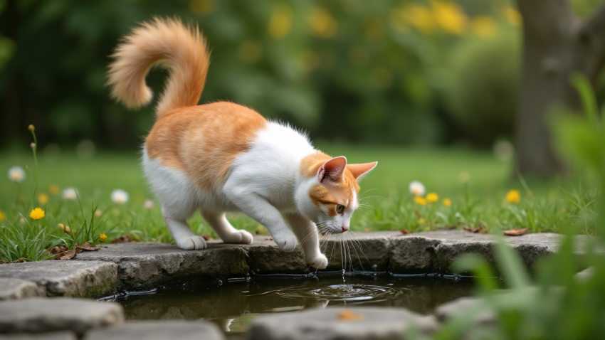 Curious Cat Playing by a Garden Pond
