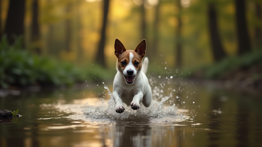 Excited Dog Running Through Water in Forest Stream