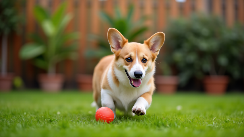 Happy Corgi Playing with a Red Ball in the Backyard