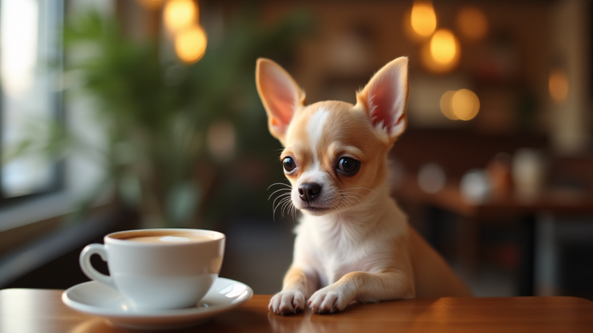 Adorable Chihuahua Sitting by a Cup of Coffee in a Cozy Café