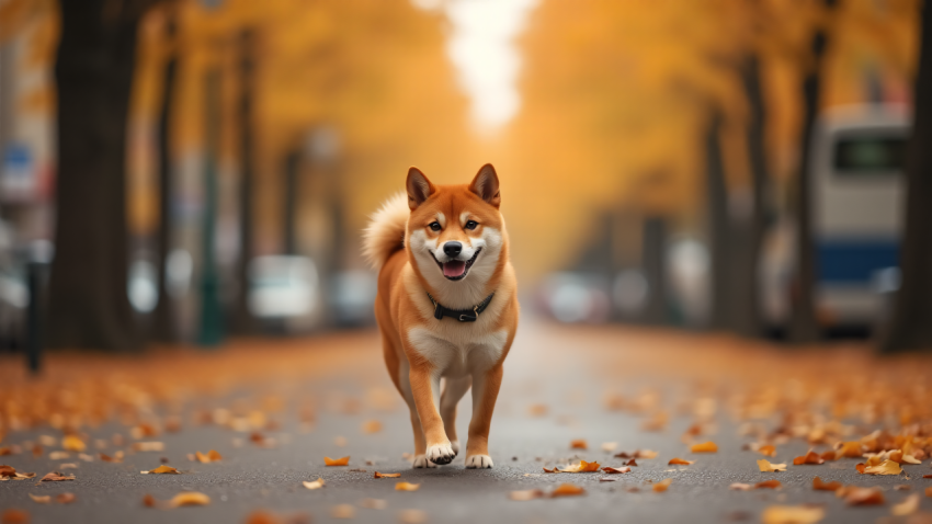 Shiba Inu Walking on an Autumn Street