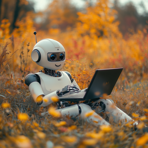 Friendly Robot Working on a Laptop in an Autumn Meadow