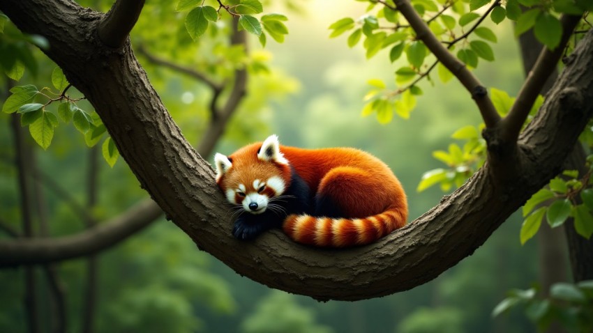 Red Panda Resting on Tree Branch Amidst Green Canopy