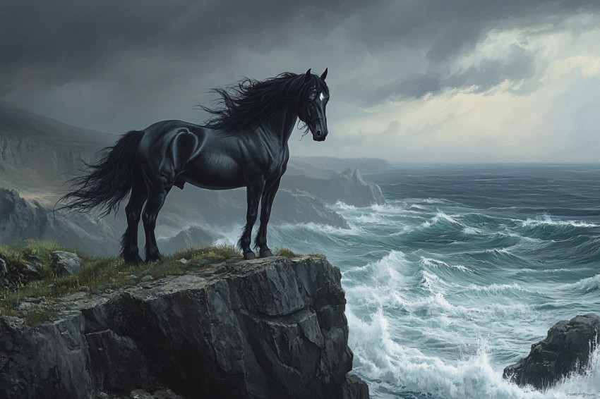Giant stone face with piercing blue eye emerging from coastal cliffside