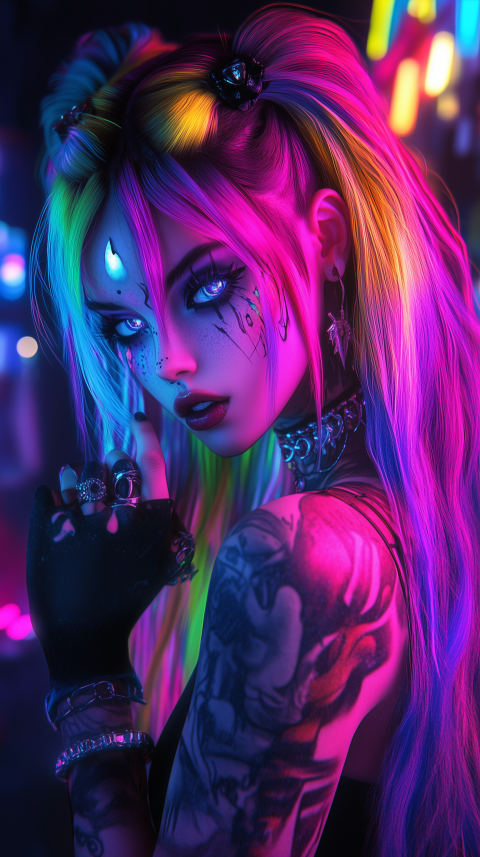 Neon Cyberpunk Portrait of a Tattooed Woman
