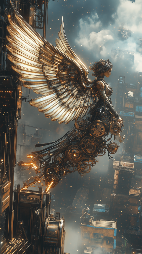 Steampunk Angel with Mechanical Wings in Futuristic City
