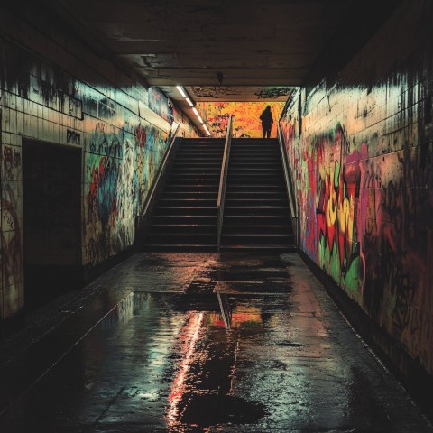 Dystopian underground walkway with colorful graffiti and lone figure