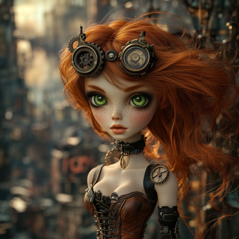 Steampunk Doll with Fiery Red Hair and Green Eyes in an Industrial Setting