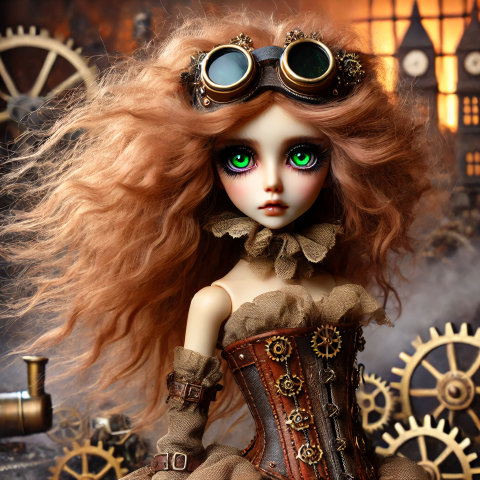 Steampunk Doll with Fiery Red Hair and Mesmerizing Green Eyes in a Gear-Filled Industrial Setting