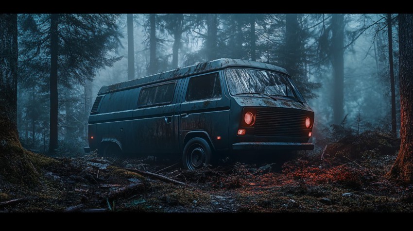 Scary Van in the Woods with Dark Creepy Atmosphere