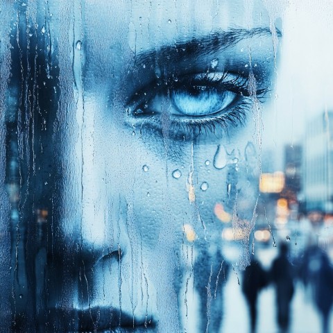 Sad Face Reflected in Rain-Soaked Window on Blue Monday