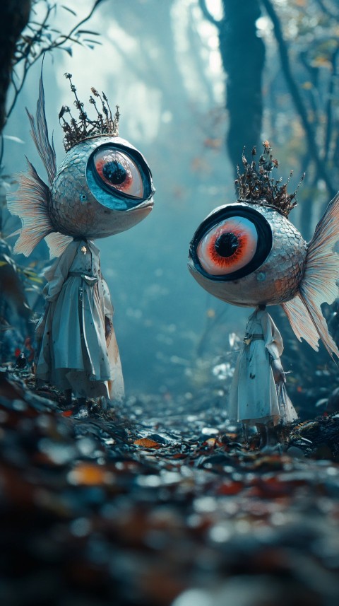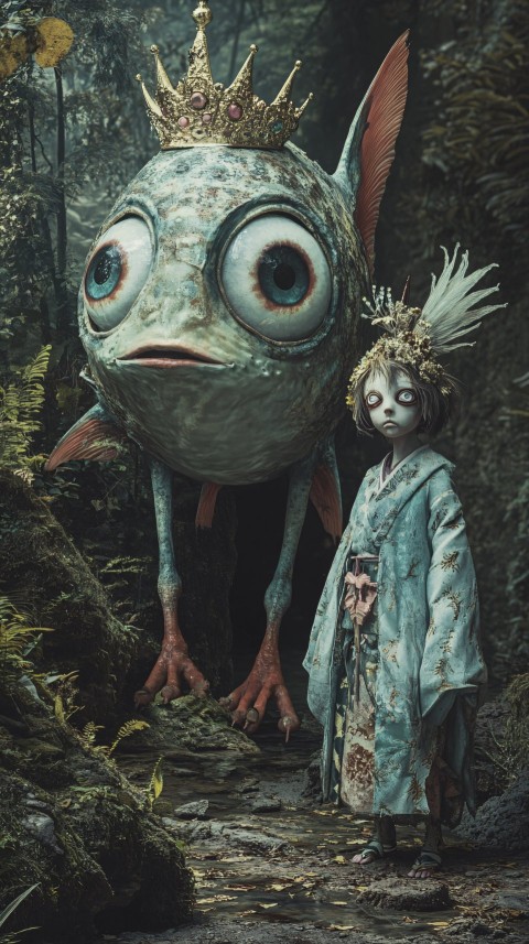 Surreal Eye Creature with Crown and Fish Ear in Dark Forest