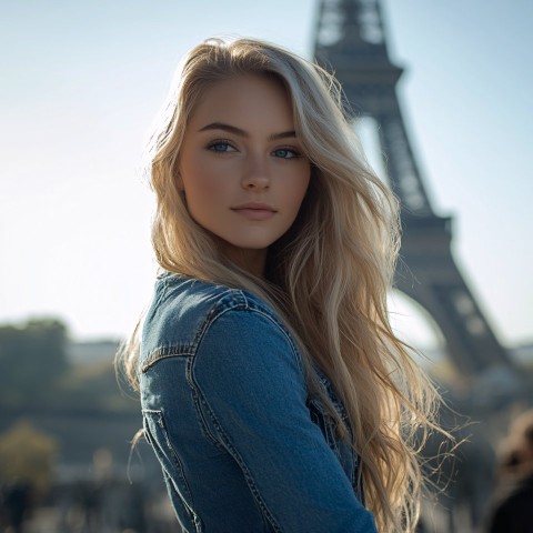 Blonde Woman in Casual Outfit by Eiffel Tower