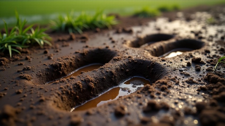 Football Cleat Imprints on Muddy Field Close-Up