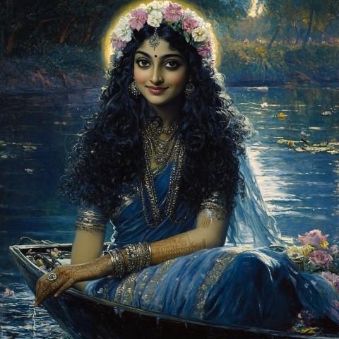 Hindu Goddess in Boat with Blue Saree