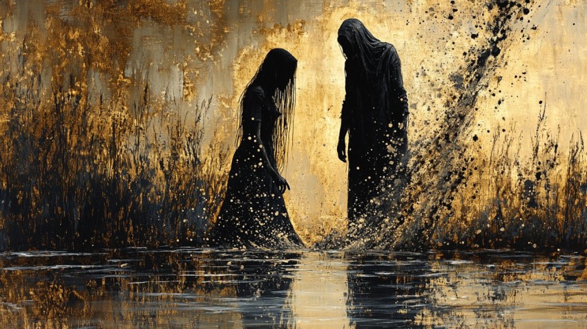 Modern Sumi-e Painting with Gold Leaf and Sunset Harmony