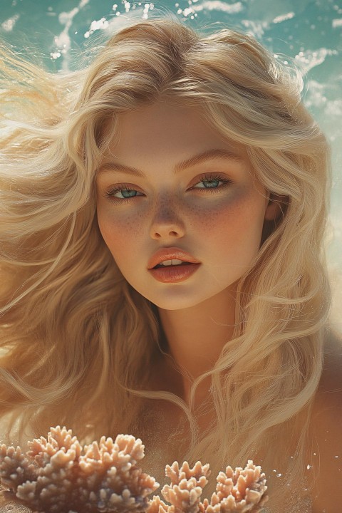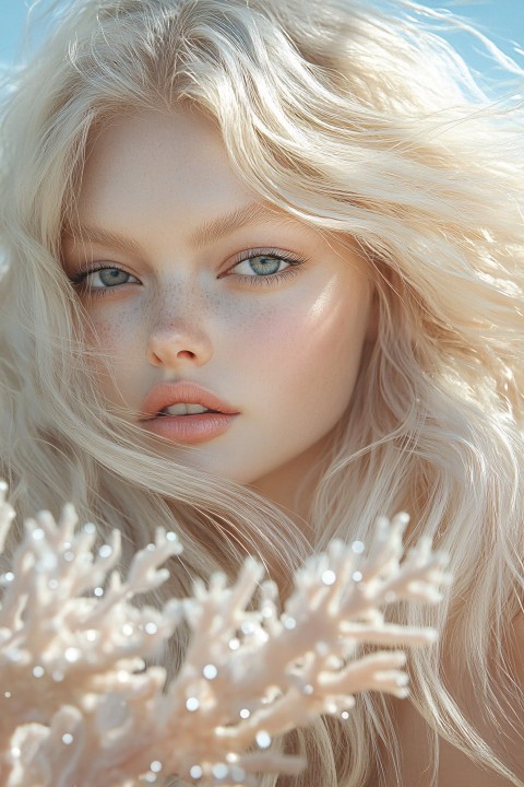 Blonde Woman Portrait on Serene Coastal Beach Scene