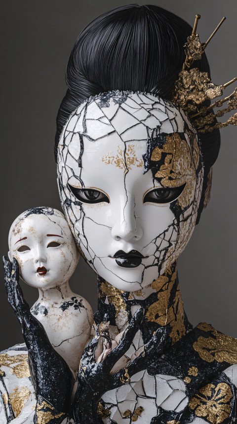 Surreal White Mask Holding Creepy Doll with Porcelain Geisha