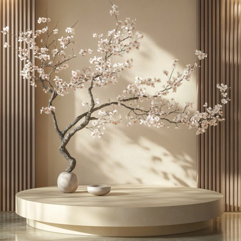 3D Japanese Pedestal with Sakura Branch Background