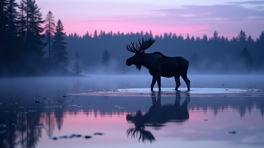 Moose Standing in Twilight Lake Amidst Northern Forest