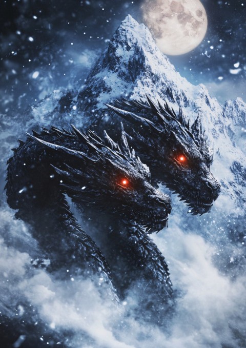 Three-Headed Black Dragon with Red Eyes in Snowy Mountains