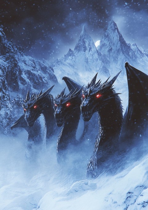 Three-Headed Black Dragon with Red Eyes in Snowy Mountains by Nataly