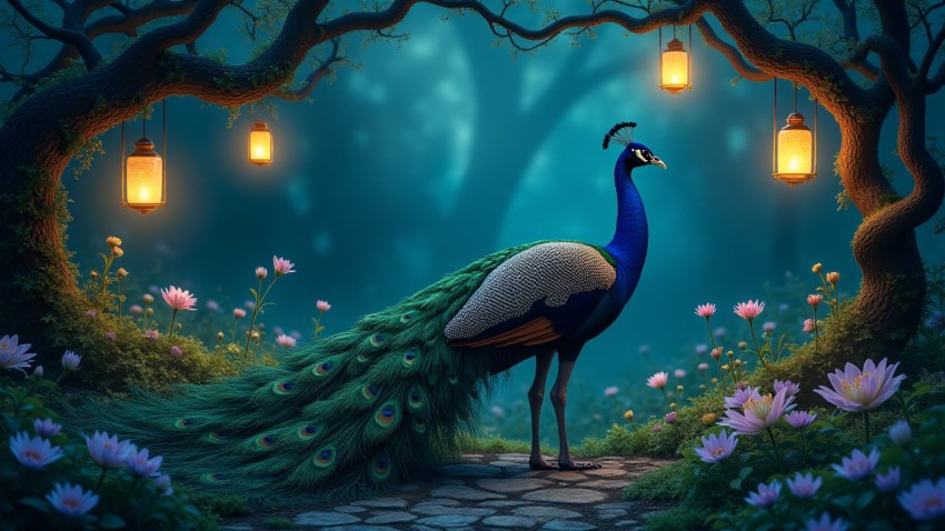 Art Nouveau Peacock in Moonlit Enchanted Garden