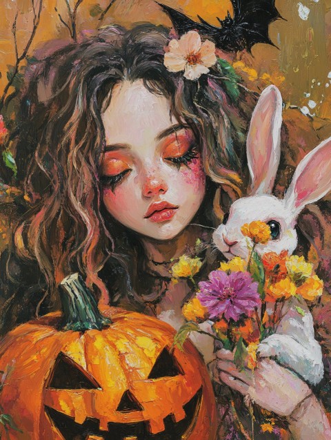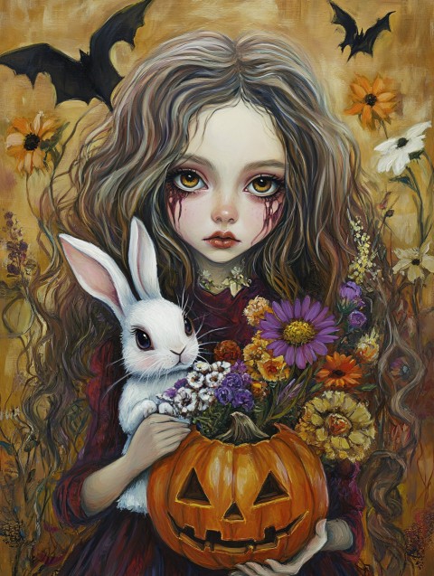 Halloween Girl with Rabbit and Flowers
