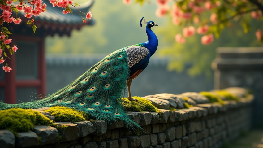 Peacock Displaying Feathers on Ancient Mossy Stone Wall