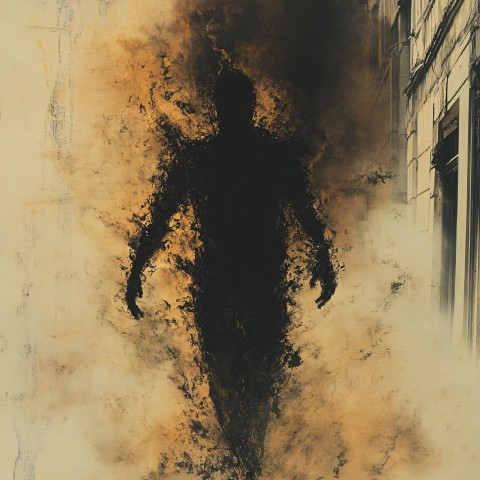 Inky Black Humanoid Emerging From Burning Building