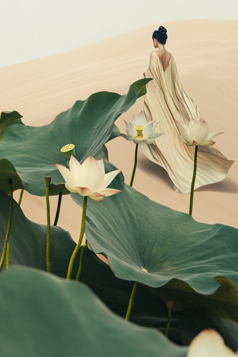 Huge Lotus Leaves Wrapped Around Woman on Sand Dune