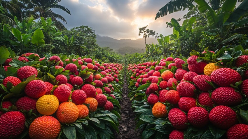 Vivid Tropical Paradise with Huge Fruits and Lush Landscape