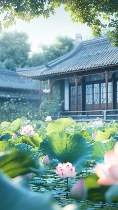 Traditional Japanese Tea House by a Tranquil Koi Pond in a Serene Bamboo Garden