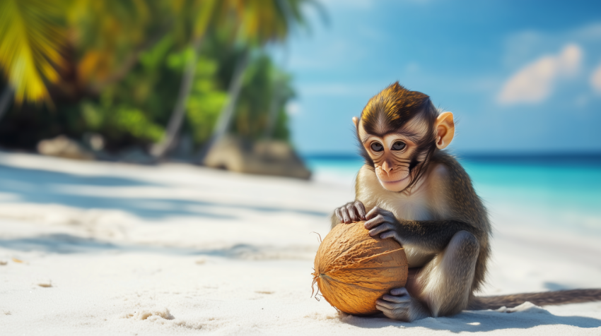 Small Monkey Playing with a Coconut on a Tropical Beach